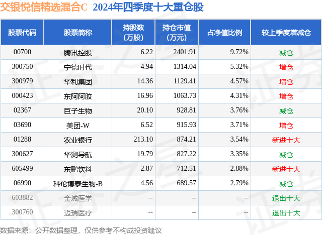 证券之星消息,日前交银悦信精选混合C基金公布四季报,2024年四季度最新规模1.59亿元,季度净值涨幅为-2.46%。