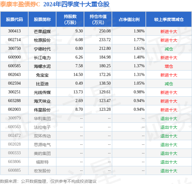 从基金规模来看,泰康丰盈债券C基金2024年四季度公布的基金规模为0.0亿元,较上一期规模4.88万元变化了-1.9万元,环比变化了-38.91%。该基金最新一期资产配置为:股票占净值比14.88%,债券占净值比104.02%,现金占净值比0.53%。从基金持仓来看,该基金当季前十大股票仓位达13.27%,第一大重仓股为芒果超媒(300413),持仓占比为1.9%。