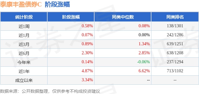 从业绩表现来看,泰康丰盈债券C基金过去一年净值涨幅为4.87%,在同类基金中排名713/1102,同类基金过去一年净值涨幅中位数为6.62%。而基金过去一年的最大回撤为-2.46%,成立以来的最大回撤为-2.46%。