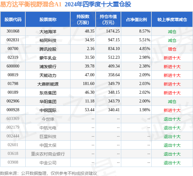 从基金规模来看,易方达平衡视野混合A1基金2024年四季度公布的基金规模为0.78亿元,较上一期规模2.33亿元变化了-1.55亿元,环比变化了-66.48%。该基金最新一期资产配置为:股票占净值比80.34%,无债券类资产,现金占净值比20.46%。从基金持仓来看,该基金当季前十大股票仓位达34.41%,第一大重仓股为大地海洋(301068),持仓占比为8.57%。