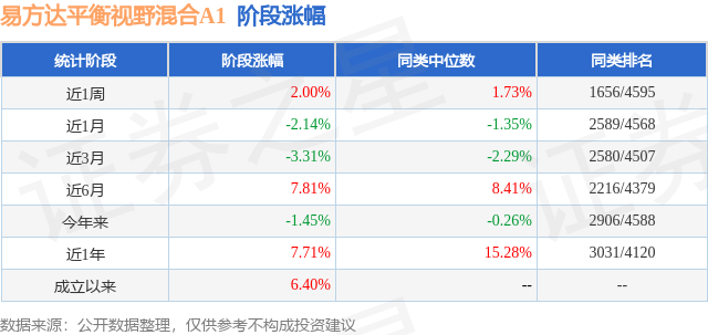从业绩表现来看,易方达平衡视野混合A1基金过去一年净值涨幅为7.71%,在同类基金中排名3031/4120,同类基金过去一年净值涨幅中位数为15.28%。而基金过去一年的最大回撤为-11.66%,成立以来的最大回撤为-11.66%。