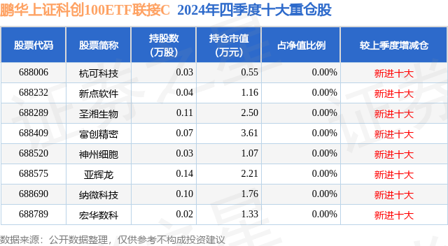 从基金规模来看,鹏华上证科创100ETF联接C基金2024年四季度公布的基金规模为7.7亿元,较上一期规模7.6亿元变化了1016.84万元,环比变化了1.34%。该基金最新一期资产配置为:股票占净值比0.01%,无债券类资产,现金占净值比5.92%。从基金持仓来看,该基金当季前十大股票仓位达0.0%,第一大重仓股为杭可科技(688006),持仓占比为0.0%。