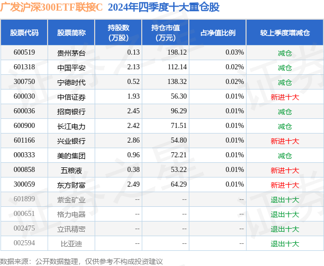 从基金规模来看,广发沪深300ETF联接C基金2024年四季度公布的基金规模为33.56亿元,较上一期规模38.4亿元变化了-4.84亿元,环比变化了-12.6%。该基金最新一期资产配置为:股票占净值比0.6%,债券占净值比0.28%,现金占净值比6.58%。从基金持仓来看,该基金当季前十大股票仓位达0.14%,第一大重仓股为贵州茅台(600519),持仓占比为0.03%。