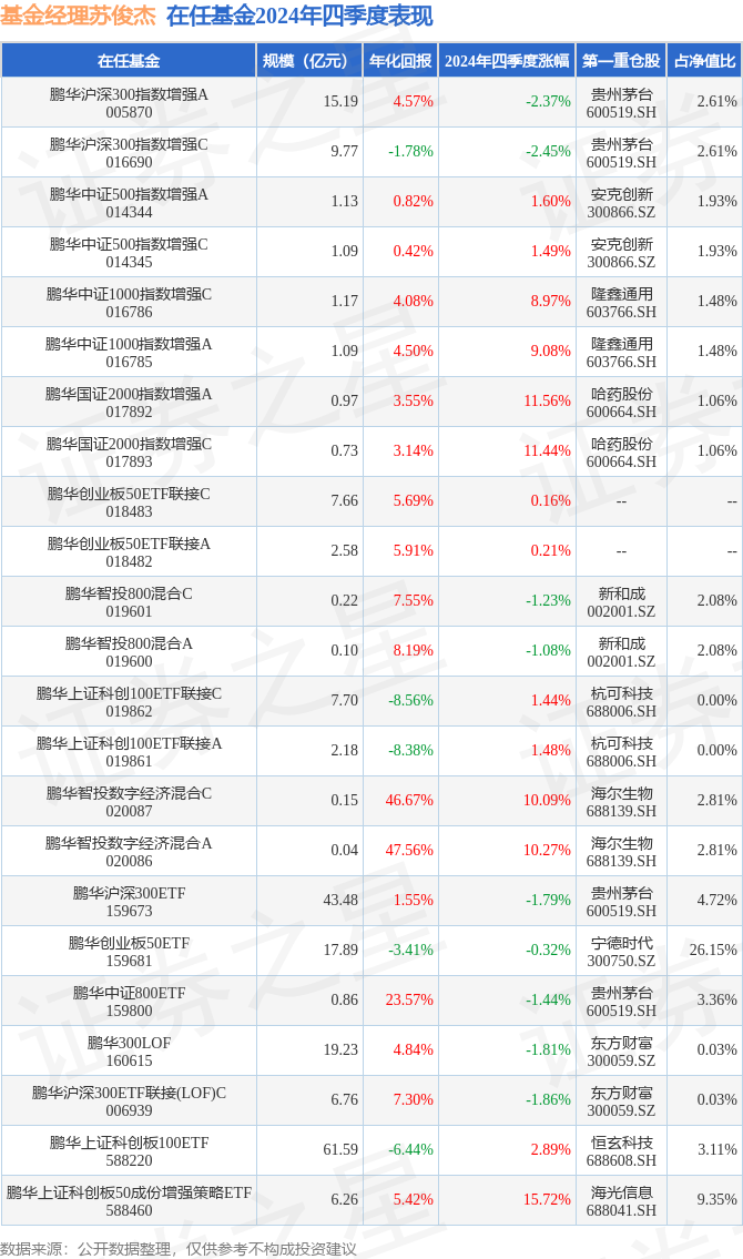 从基金规模来看,鹏华上证科创100ETF联接A基金2024年四季度公布的基金规模为2.18亿元,较上一期规模1.87亿元变化了3099.48万元,环比变化了16.54%。该基金最新一期资产配置为:股票占净值比0.01%,无债券类资产,现金占净值比5.92%。从基金持仓来看,该基金当季前十大股票仓位达0.0%,第一大重仓股为杭可科技(688006),持仓占比为0.0%。
