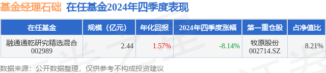 证券之星消息,日前融通通乾研究精选混合基金公布四季报,2024年四季度最新规模2.44亿元,季度净值涨幅为-8.14%。