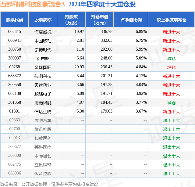 从基金规模来看,西部利得科技创新混合A基金2024年四季度公布的基金规模为0.03亿元,较上一期规模511.78万元变化了-195.84万元,环比变化了-38.27%。该基金最新一期资产配置为:股票占净值比85.42%,无债券类资产,现金占净值比15.45%。从基金持仓来看,该基金当季前十大股票仓位达49.12%,第一大重仓股为海康威视(002415),持仓占比为6.89%。