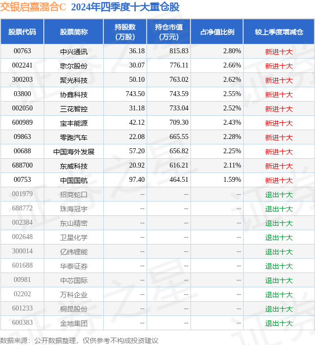 从基金规模来看,交银启嘉混合C基金2024年四季度公布的基金规模为1.36亿元,较上一期规模1.73亿元变化了-3750.62万元,环比变化了-21.65%。该基金最新一期资产配置为:股票占净值比93.37%,债券占净值比2.27%,现金占净值比4.85%。从基金持仓来看,该基金当季前十大股票仓位达23.81%,第一大重仓股为中兴通讯(00763),持仓占比为2.8%。