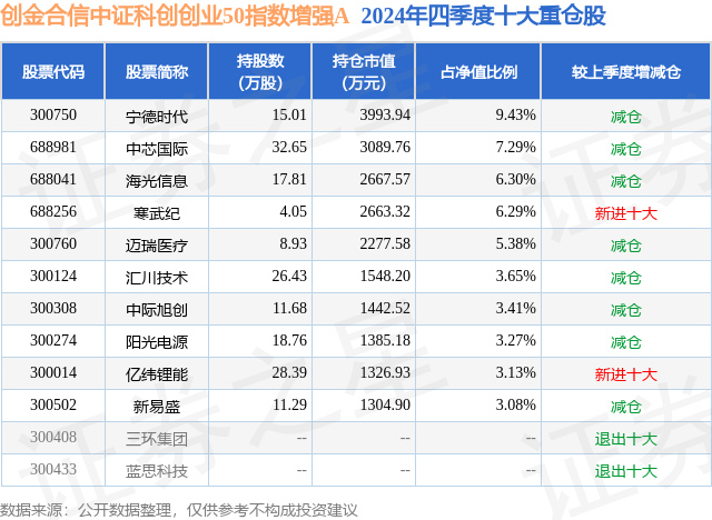 从基金规模来看,创金合信中证科创创业50指数增强A基金2024年四季度公布的基金规模为1.92亿元,较上一期规模2.25亿元变化了-3364.06万元,环比变化了-14.93%。该基金最新一期资产配置为:股票占净值比94.28%,无债券类资产,现金占净值比2.59%。从基金持仓来看,该基金当季前十大股票仓位达51.23%,第一大重仓股为宁德时代(300750),持仓占比为9.43%。