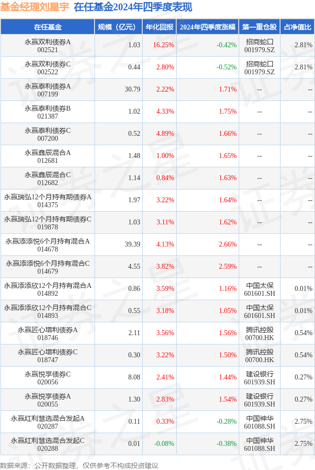 永赢匠心增利债券C现任基金经理为刘星宇。其中在任基金经理刘星宇已从业1年又323天,2023年9月22日正式接手管理永赢匠心增利债券C,任职期间累计回报为4.92%。目前还管理着19只基金产品(包括A类和C类),其中本季度表现最佳的基金为永赢添添悦6个月持有混合A(014678),季度净值涨幅为2.66%。