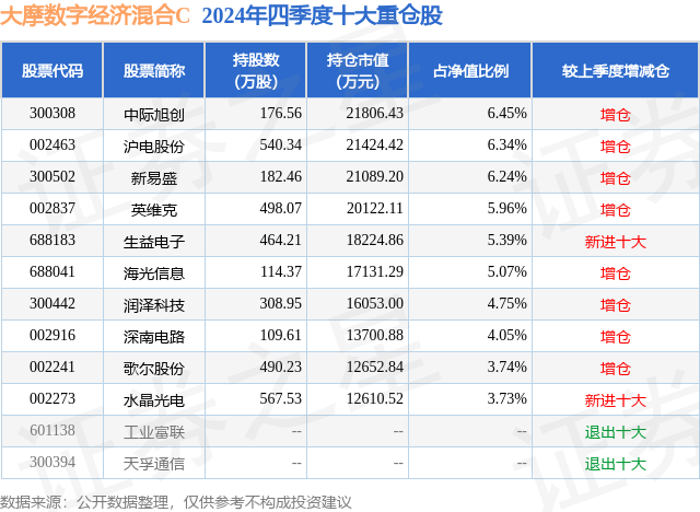 从基金规模来看,大摩数字经济混合C基金2024年四季度公布的基金规模为16.64亿元,较上一期规模11.85亿元变化了4.79亿元,环比变化了40.41%。该基金最新一期资产配置为:股票占净值比90.18%,无债券类资产,现金占净值比14.11%。从基金持仓来看,该基金当季前十大股票仓位达51.72%,第一大重仓股为中际旭创(300308),持仓占比为6.45%。