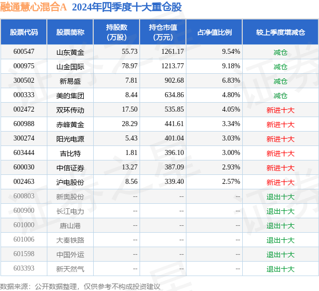 从基金规模来看,融通慧心混合A基金2024年四季度公布的基金规模为1.12亿元,较上一期规模2.06亿元变化了-9397.42万元,环比变化了-45.56%。该基金最新一期资产配置为:股票占净值比81.93%,无债券类资产,现金占净值比18.72%。从基金持仓来看,该基金当季前十大股票仓位达49.27%,第一大重仓股为山东黄金(600547),持仓占比为9.54%。
