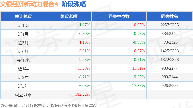从业绩表现来看,交银经济新动力混合A基金过去一年净值涨幅为13.28%,在同类基金中排名930/2277,同类基金过去一年净值涨幅中位数为11.51%。而基金过去一年的最大回撤为-6.42%,成立以来的最大回撤为-34.96%。