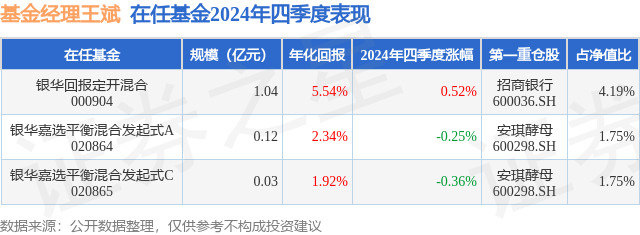 证券之星消息,日前银华回报定开混合基金公布四季报,2024年四季度最新规模1.04亿元,季度净值涨幅为0.52%。