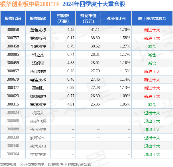从基金规模来看,银华创业板中盘200ETF基金2024年四季度公布的基金规模为0.24亿元,较上一期规模4924.36万元变化了-2507.58万元,环比变化了-50.92%。该基金最新一期资产配置为:股票占净值比95.24%,无债券类资产,现金占净值比4.74%。从基金持仓来看,该基金当季前十大股票仓位达12.44%,第一大重仓股为蓝色光标(300058),持仓占比为1.7%。