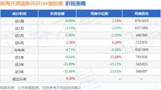 从业绩表现来看,前海开源强势共识100强股票基金过去一年净值涨幅为-0.64%,在同类基金中排名793/926,同类基金过去一年净值涨幅中位数为15.69%。而基金过去一年的最大回撤为-21.34%,成立以来的最大回撤为-52.74%。