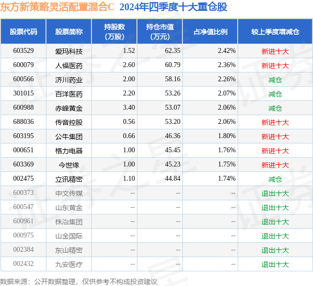 从基金规模来看,东方新策略灵活配置混合C基金2024年四季度公布的基金规模为0.0亿元,较上一期规模20.73万元变化了-0.75万元,环比变化了-3.61%。该基金最新一期资产配置为:股票占净值比73.93%,债券占净值比6.25%,现金占净值比3.54%。从基金持仓来看,该基金当季前十大股票仓位达20.28%,第一大重仓股为爱玛科技(603529),持仓占比为2.42%。