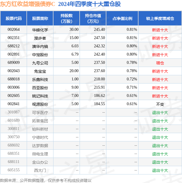从基金规模来看,东方红收益增强债券C基金2024年四季度公布的基金规模为1.47亿元,较上一期规模3131.57万元变化了1.16亿元,环比变化了368.87%。该基金最新一期资产配置为:股票占净值比16.26%,债券占净值比83.21%,现金占净值比3.15%。从基金持仓来看,该基金当季前十大股票仓位达7.43%,第一大重仓股为华峰化学(002064),持仓占比为0.81%。