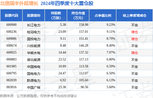 从基金规模来看,北信瑞丰外延增长基金2024年四季度公布的基金规模为0.17亿元,较上一期规模2041.87万元变化了-318.86万元,环比变化了-15.62%。该基金最新一期资产配置为:股票占净值比87.24%,无债券类资产,现金占净值比8.7%。从基金持仓来看,该基金当季前十大股票仓位达75.21%,第一大重仓股为长江电力(600900),持仓占比为9.23%。