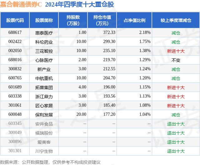 从基金规模来看,嘉合磐通债券C基金2024年四季度公布的基金规模为0.38亿元,较上一期规模4781.38万元变化了-978.11万元,环比变化了-20.46%。该基金最新一期资产配置为:股票占净值比16.08%,债券占净值比85.55%,现金占净值比0.4%。从基金持仓来看,该基金当季前十大股票仓位达13.44%,第一大重仓股为惠泰医疗(688617),持仓占比为2.18%。