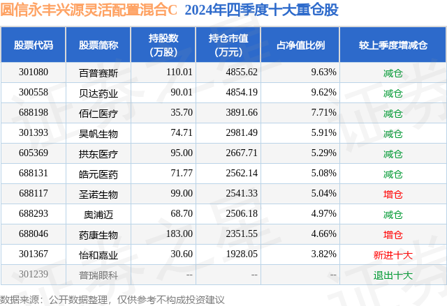 从基金规模来看,圆信永丰兴源灵活配置混合C基金2024年四季度公布的基金规模为2.21亿元,较上一期规模3.63亿元变化了-1.41亿元,环比变化了-38.94%。该基金最新一期资产配置为:股票占净值比98.13%,债券占净值比5.41%,现金占净值比0.84%。从基金持仓来看,该基金当季前十大股票仓位达61.73%,第一大重仓股为百普赛斯(301080),持仓占比为9.63%。