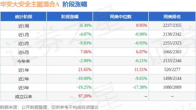 从业绩表现来看,华安大安全主题混合A基金过去一年净值涨幅为21.65%,在同类基金中排名520/2277,同类基金过去一年净值涨幅中位数为11.51%。而基金过去一年的最大回撤为-19.06%,成立以来的最大回撤为-50.31%。