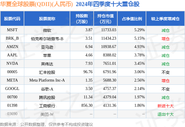 从基金规模来看,华夏全球股票(QDII)(人民币)基金2024年四季度公布的基金规模为22.19亿元,较上一期规模21.53亿元变化了6648.26万元,环比变化了3.09%。该基金最新一期资产配置为:股票占净值比81.82%,无债券类资产,现金占净值比8.71%。从基金持仓来看,该基金当季前十大股票仓位达34.19%,第一大重仓股为微软(MSFT),持仓占比为5.29%。