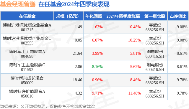 博时沪港深优质企业基金A现任基金经理为曾鹏。其中在任基金经理曾鹏已从业12年又8天,2021年1月20日正式接手管理博时沪港深优质企业基金A,任职期间累计回报为-33.22%。目前还管理着6只基金产品(包括A类和C类),其中本季度表现最佳的基金为博时特许价值混合A(050010),季度净值涨幅为11.48%。