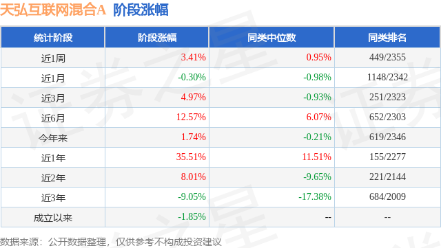 从业绩表现来看,天弘互联网混合A基金过去一年净值涨幅为35.51%,在同类基金中排名155/2277,同类基金过去一年净值涨幅中位数为11.51%。而基金过去一年的最大回撤为-16.28%,成立以来的最大回撤为-53.95%。