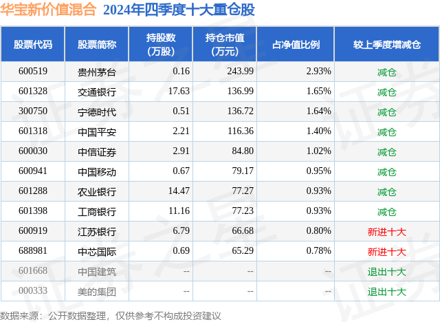 从基金规模来看,华宝新价值混合基金2024年四季度公布的基金规模为0.83亿元,较上一期规模1.17亿元变化了-3378.92万元,环比变化了-28.87%。该基金最新一期资产配置为:股票占净值比39.68%,债券占净值比50.51%,现金占净值比3.87%。从基金持仓来看,该基金当季前十大股票仓位达13.03%,第一大重仓股为贵州茅台(600519),持仓占比为2.93%。