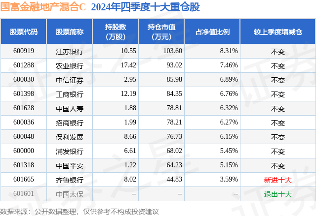 从基金规模来看,国富金融地产混合C基金2024年四季度公布的基金规模为0.05亿元,较上一期规模506.08万元变化了-49.53万元,环比变化了-9.79%。该基金最新一期资产配置为:股票占净值比92.55%,无债券类资产,现金占净值比7.56%。从基金持仓来看,该基金当季前十大股票仓位达62.35%,第一大重仓股为江苏银行(600919),持仓占比为8.31%。
