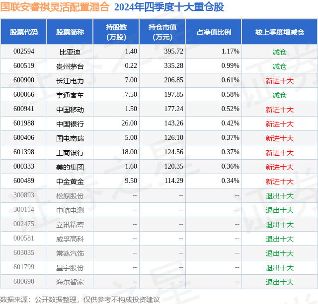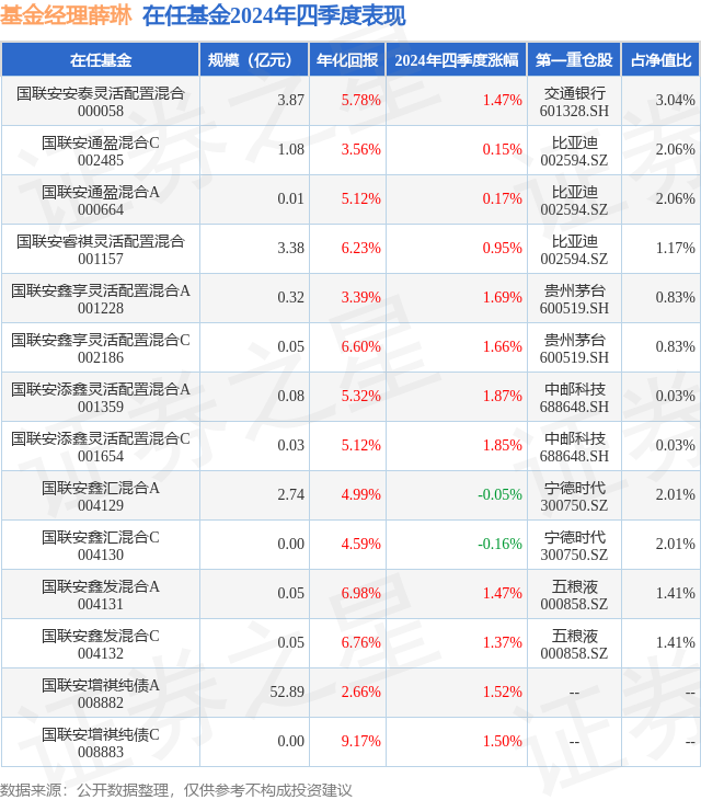 从基金规模来看,国联安睿祺灵活配置混合基金2024年四季度公布的基金规模为3.38亿元,较上一期规模4.22亿元变化了-8403.4万元,环比变化了-19.9%。该基金最新一期资产配置为:股票占净值比16.65%,债券占净值比75.5%,现金占净值比0.65%。从基金持仓来看,该基金当季前十大股票仓位达5.73%,第一大重仓股为比亚迪(002594),持仓占比为1.17%。