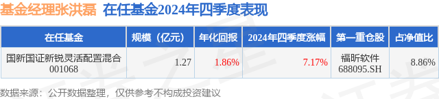 从基金规模来看,国新国证新锐灵活配置混合基金2024年四季度公布的基金规模为1.27亿元,较上一期规模1.2亿元变化了722.08万元,环比变化了6.01%。该基金最新一期资产配置为:股票占净值比89.9%,无债券类资产,现金占净值比14.15%。从基金持仓来看,该基金当季前十大股票仓位达58.91%,第一大重仓股为福昕软件(688095),持仓占比为8.86%。