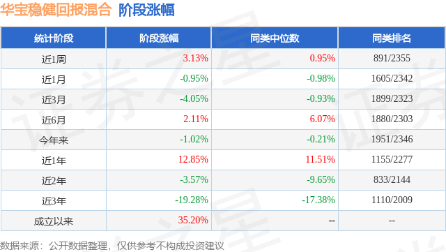 从业绩表现来看,华宝稳健回报混合基金过去一年净值涨幅为12.85%,在同类基金中排名1155/2277,同类基金过去一年净值涨幅中位数为11.51%。而基金过去一年的最大回撤为-11.65%,成立以来的最大回撤为-51.51%。