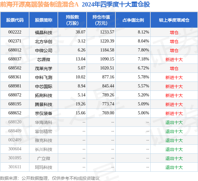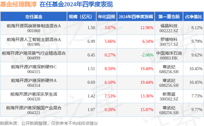 证券之星消息,日前前海开源高端装备制造混合A基金公布四季报,2024年四季度最新规模1.5亿元,季度净值涨幅为12.96%。