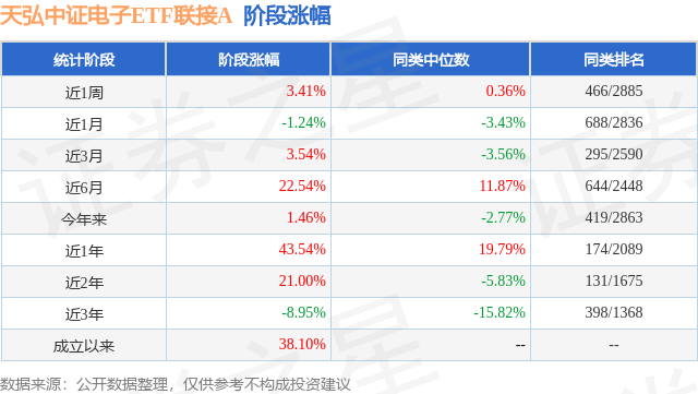 从业绩表现来看,天弘中证电子ETF联接A基金过去一年净值涨幅为43.54%,在同类基金中排名174/2089,同类基金过去一年净值涨幅中位数为19.79%。而基金过去一年的最大回撤为-16.45%,成立以来的最大回撤为-49.02%。