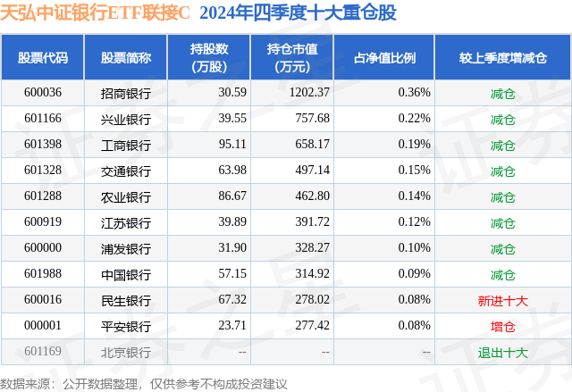 证券之星消息,日前天弘中证银行ETF联接C基金公布四季报,2024年四季度最新规模23.16亿元,季度净值涨幅为5.35%。