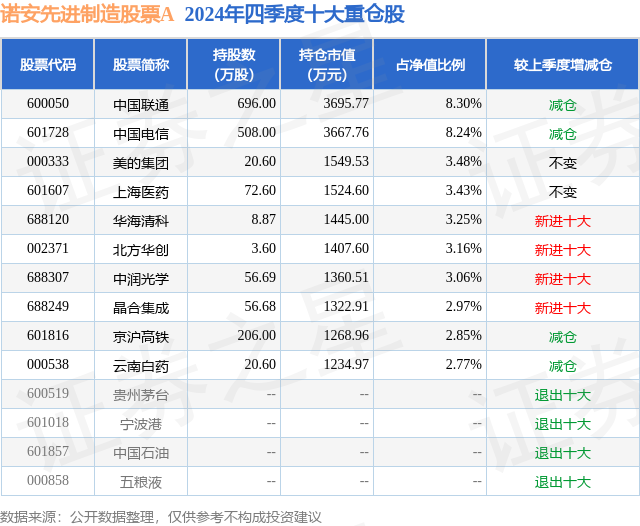 从基金规模来看,诺安先进制造股票A基金2024年四季度公布的基金规模为4.29亿元,较上一期规模3.91亿元变化了3790.43万元,环比变化了9.7%。该基金最新一期资产配置为:股票占净值比81.65%,无债券类资产,现金占净值比18.79%。从基金持仓来看,该基金当季前十大股票仓位达41.51%,第一大重仓股为中国联通(600050),持仓占比为8.3%。