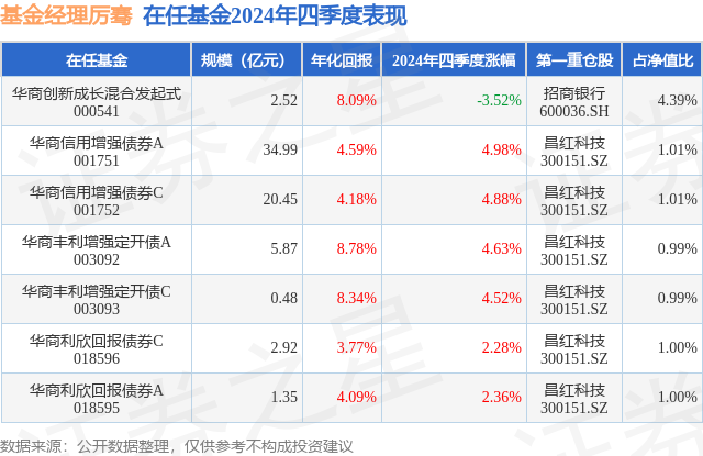 从基金规模来看,华商信用增强债券A基金2024年四季度公布的基金规模为34.99亿元,较上一期规模37.18亿元变化了-2.19亿元,环比变化了-5.89%。该基金最新一期资产配置为:股票占净值比19.14%,债券占净值比92.89%,现金占净值比3.8%。从基金持仓来看,该基金当季前十大股票仓位达6.67%,第一大重仓股为昌红科技(300151),持仓占比为1.01%。
