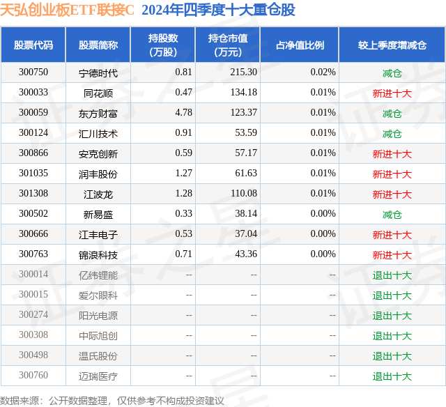 从基金规模来看,天弘创业板ETF联接C基金2024年四季度公布的基金规模为83.67亿元,较上一期规模81.56亿元变化了2.11亿元,环比变化了2.59%。该基金最新一期资产配置为:股票占净值比0.18%,无债券类资产,现金占净值比5.9%。从基金持仓来看,该基金当季前十大股票仓位达0.08%,第一大重仓股为宁德时代(300750),持仓占比为0.02%。