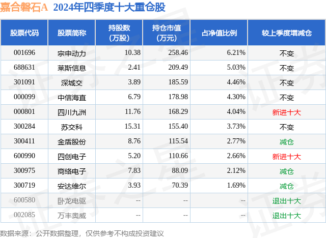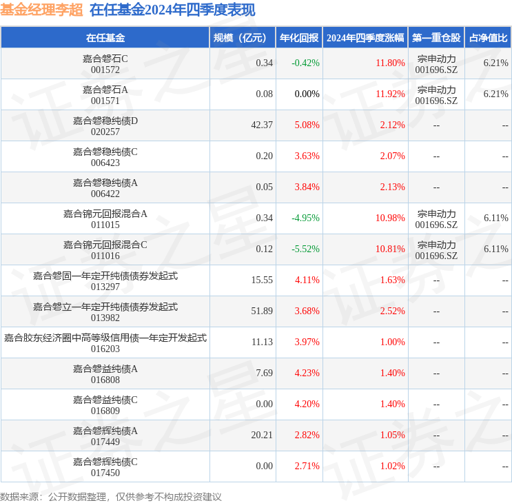 证券之星消息,日前嘉合磐石A基金公布四季报,2024年四季度最新规模0.08亿元,季度净值涨幅为11.92%。
