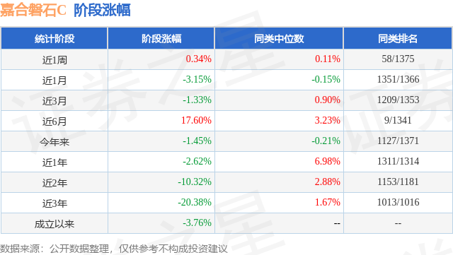 从业绩表现来看,嘉合磐石C基金过去一年净值涨幅为-2.62%,在同类基金中排名1311/1314,同类基金过去一年净值涨幅中位数为6.98%。而基金过去一年的最大回撤为-23.26%,成立以来的最大回撤为-47.41%。