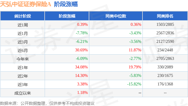 从业绩表现来看,天弘中证证券保险A基金过去一年净值涨幅为34.08%,在同类基金中排名330/2089,同类基金过去一年净值涨幅中位数为19.79%。而基金过去一年的最大回撤为-20.57%,成立以来的最大回撤为-39.77%。