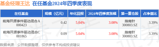 从基金规模来看,前海开源事件驱动混合A基金2024年四季度公布的基金规模为0.42亿元,较上一期规模4182.65万元变化了3.36万元,环比变化了0.08%。该基金最新一期资产配置为:股票占净值比90.52%,无债券类资产,现金占净值比9.5%。从基金持仓来看,该基金当季前十大股票仓位达31.36%,第一大重仓股为指南针(300803),持仓占比为3.39%。