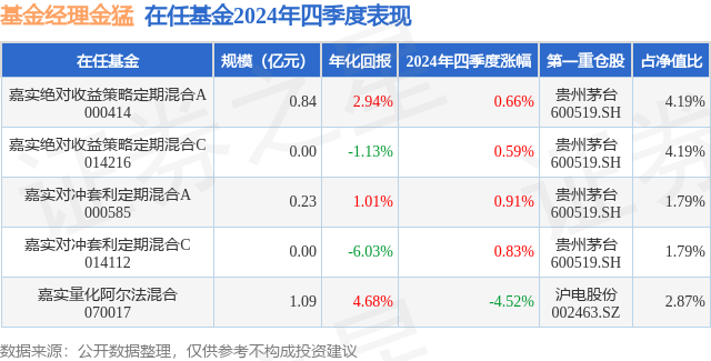 证券之星消息,日前嘉实绝对收益策略定期混合A基金公布四季报,2024年四季度最新规模0.84亿元,季度净值涨幅为0.66%。