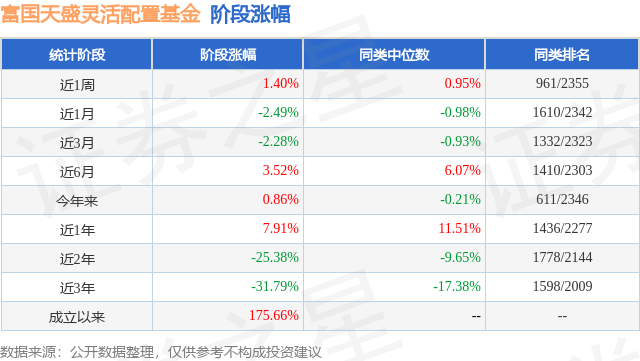 从业绩表现来看,富国天盛灵活配置基金基金过去一年净值涨幅为7.91%,在同类基金中排名1436/2277,同类基金过去一年净值涨幅中位数为11.51%。而基金过去一年的最大回撤为-23.32%,成立以来的最大回撤为-52.45%。