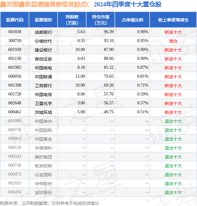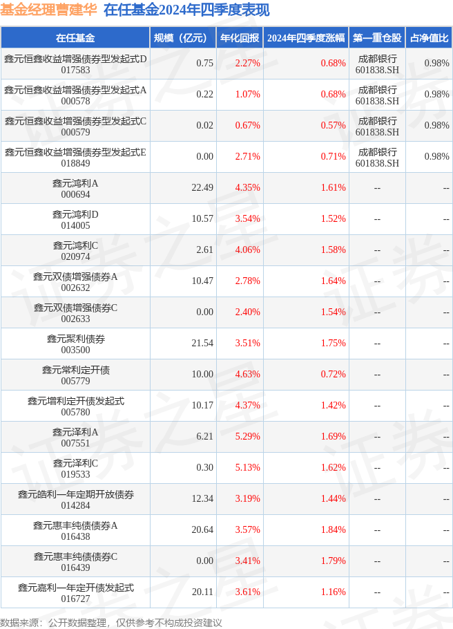 从基金规模来看,鑫元恒鑫收益增强债券型发起式C基金2024年四季度公布的基金规模为0.02亿元,较上一期规模192.25万元变化了1.93万元,环比变化了1.0%。该基金最新一期资产配置为:股票占净值比13.83%,债券占净值比101.55%,现金占净值比2.05%。从基金持仓来看,该基金当季前十大股票仓位达7.79%,第一大重仓股为成都银行(601838),持仓占比为0.98%。