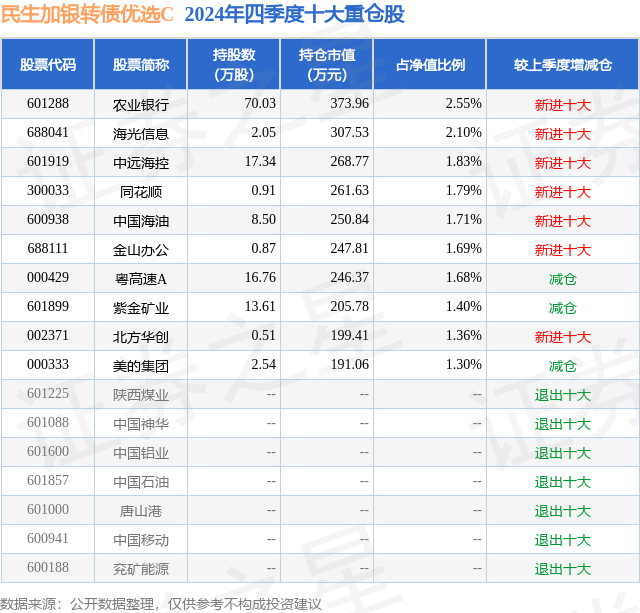 从基金规模来看,民生加银转债优选C基金2024年四季度公布的基金规模为0.83亿元,较上一期规模9760.39万元变化了-1477.62万元,环比变化了-15.14%。该基金最新一期资产配置为:股票占净值比19.66%,债券占净值比109.88%,现金占净值比2.03%。从基金持仓来看,该基金当季前十大股票仓位达17.41%,第一大重仓股为农业银行(601288),持仓占比为2.55%。