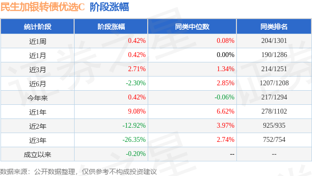 从业绩表现来看,民生加银转债优选C基金过去一年净值涨幅为9.08%,在同类基金中排名278/1102,同类基金过去一年净值涨幅中位数为6.62%。而基金过去一年的最大回撤为-19.13%,成立以来的最大回撤为-64.34%。