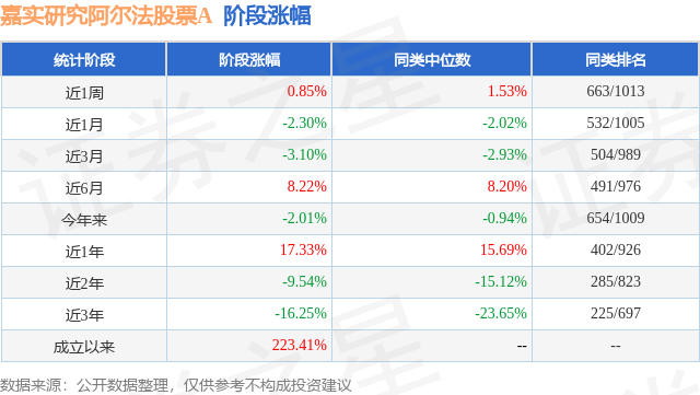 从业绩表现来看,嘉实研究阿尔法股票A基金过去一年净值涨幅为17.33%,在同类基金中排名402/926,同类基金过去一年净值涨幅中位数为15.69%。而基金过去一年的最大回撤为-14.85%,成立以来的最大回撤为-43.12%。