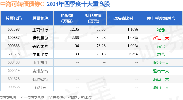 从基金规模来看,中海可转债债券C基金2024年四季度公布的基金规模为0.36亿元,较上一期规模3540.04万元变化了20.29万元,环比变化了0.57%。该基金最新一期资产配置为:股票占净值比4.07%,债券占净值比83.25%,现金占净值比8.47%。从基金持仓来看,该基金当季前十大股票仓位达4.07%,第一大重仓股为工商银行(601398),持仓占比为1.1%。